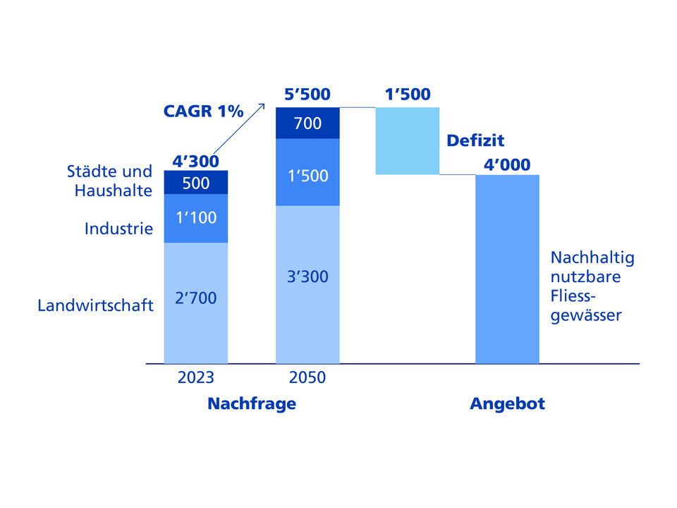 Steigender Wohlstand bei einer wachsenden Weltbevölkerung lassen die Nachfrage nach Frischwasser überproportional ansteigen. Der Klimawandel bedroht zudem die langfristige Sicherstellung von genügend Frischwasser. Folglich wird die Differenz zwischen Wassernachfrage und -angebot – die sogenannte Wasserlücke – immer breiter. Prognosen zufolge fehlt bis 2050 jährlich rund 1'500 Kubikkilometer Frischwasser. Das ist etwa 30mal die Füllmenge des Bodensees.