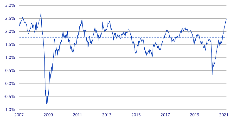 In der Finanzbranche ist das Thema «Inflation» wegen seiner – möglicherweise – verheerenden Konsequenzen in den Fokus gerückt. Im Rahmen der konjunkturellen Belebung zeichnen sich bereits erste Kapazitätsengpässe ab, die preistreibend wirken. Die Inflationserwartungen sind massiv angestiegen; Realwerte profitieren. Nachdem wir diese Entwicklung bereits im Juli 2020 antizipiert hatten, tätigen wir nun punktuell Gewinnmitnahmen. Im Frühsommer sollte bei der US-Inflationsrate der (vorläufige) Höhepunkt erreicht werden.