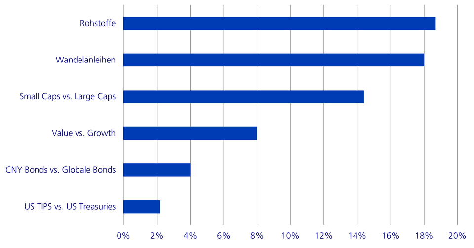 Unserer Ansicht nach war die damals eingepreiste Inflationserwartung mit rund 1,2 % eindeutig zu tief und wir fokussierten uns deshalb auf Realwerte und Anlagen mit zyklischem Charakter, die von steigenden Inflationserwartungen profitieren. In unserem typischen gemischten Portfolio befanden sich somit Anlagevehikel wie Small Caps, Wandelanleihen, US TIPS, chinesische Staatsanleihen, Value-Aktien und Rohstoffe. Mit Erfolg – wie es die Erträge unserer taktischen Positionen von November bis Februar 2021 zeigen.