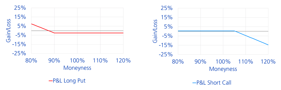 The tiered put options strategy protects against high losses, but comes at a cost. Costs can be attenuated if some of the upside potential on the equity markets is sacrificed. This is achieved by selling out-of-the-money call options. As a result, investors initially participate in the equity market development in the case of rising prices. Only once the prices exceed the strike price of the sold call option will participation stop3. An options strategy that combines the purchase of out-of-the-money put options with the sale of out-of-the-money call options is called a «collar strategy». This is because both the loss potential and the upside potential are limited.