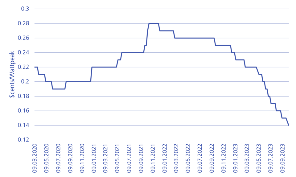 The photovoltaic (PV) market is in a perfect storm. A standard solar module cost as little as 14 US dollar cents per watt peak in September 2023. After prices rose sharply in 2021 due to raw material and supply bottlenecks, they initially stagnated last year. Prices have been in free fall since around the beginning of 2023 and are constantly reaching new record lows (see Chart 1) – and that for a form of power generation that has already been among the cheapest in the world for years. The reasons for this are complex and diverse.